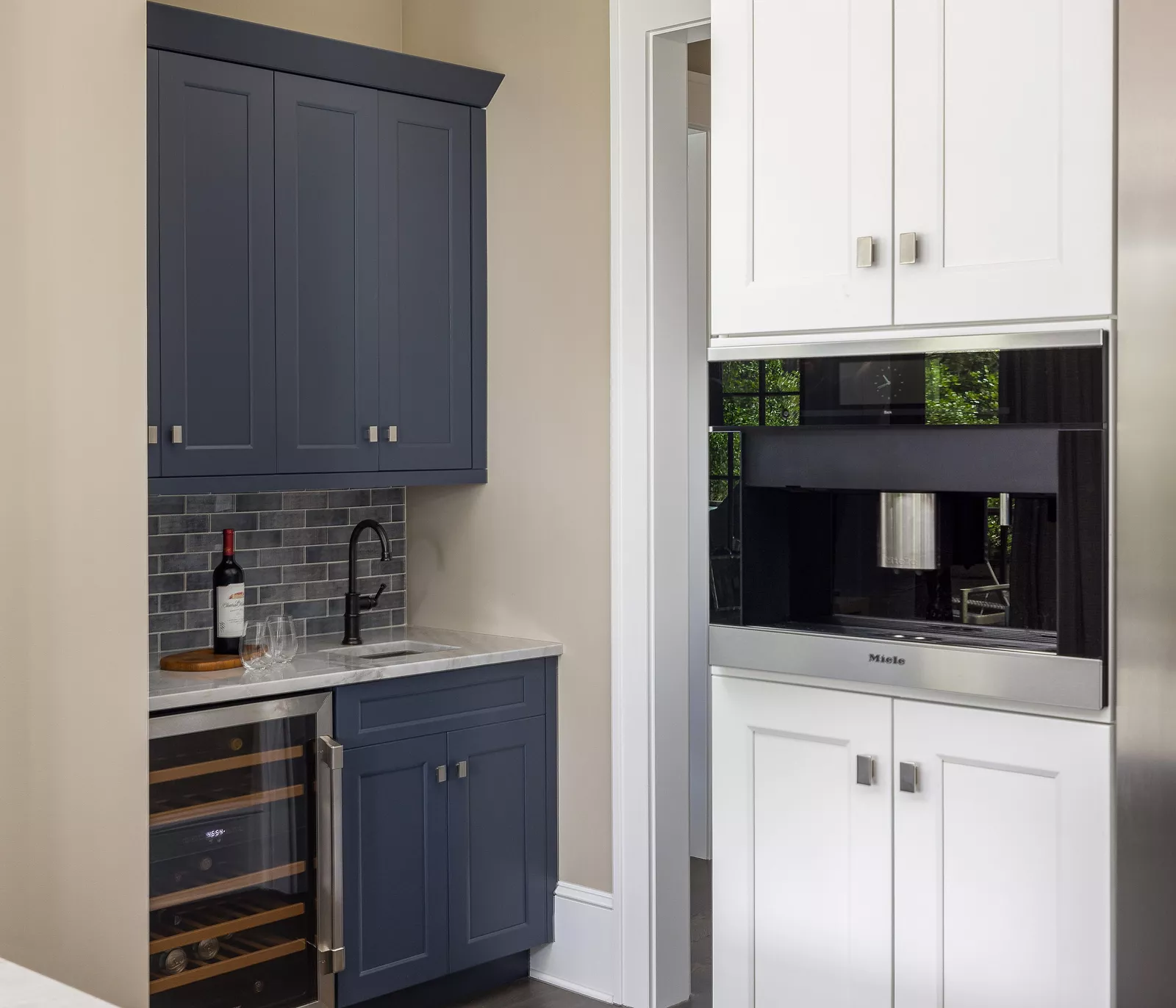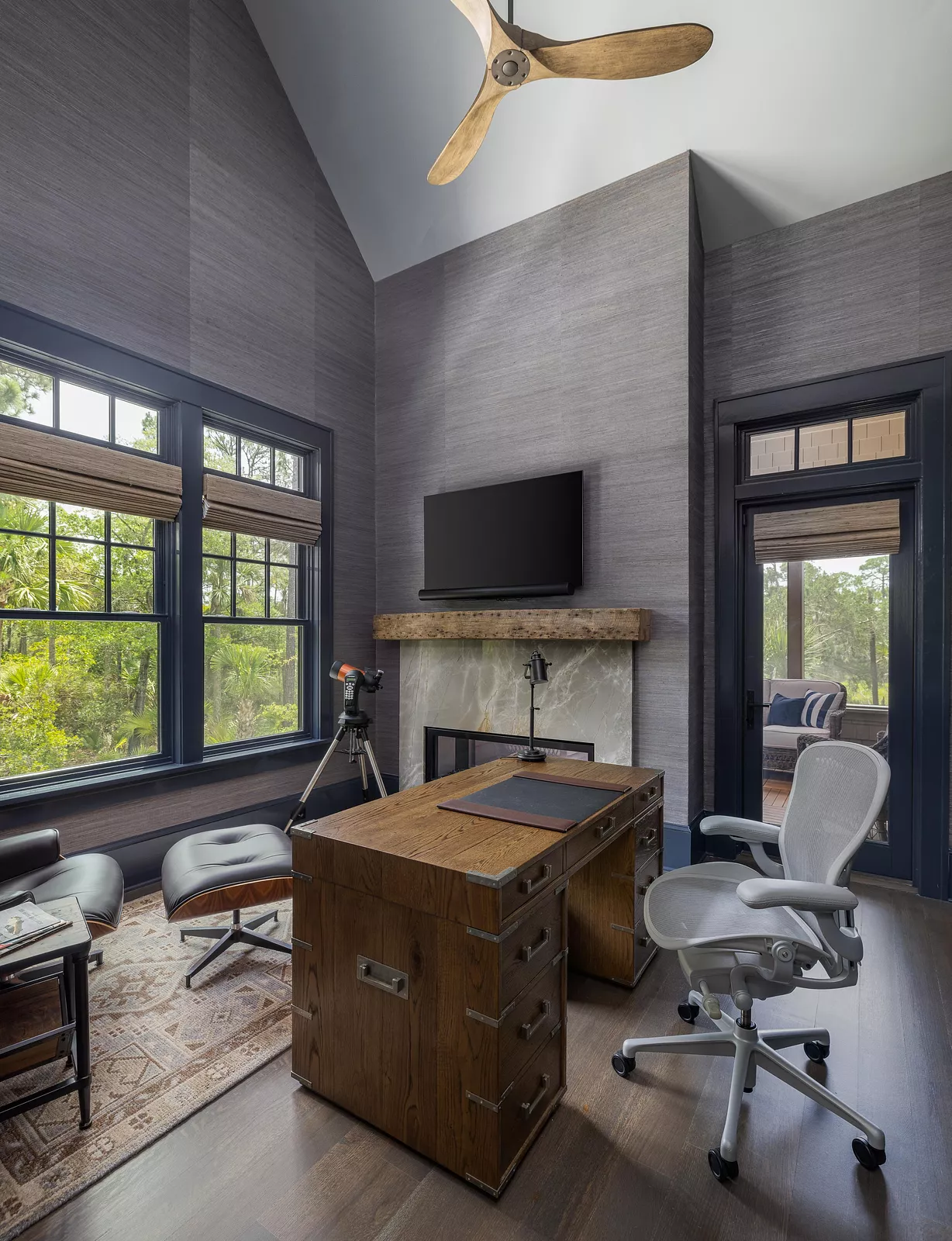 The cozy study overlooks a private screened porch and plunge pool, featuring exotic hardwood decking and cable railing.