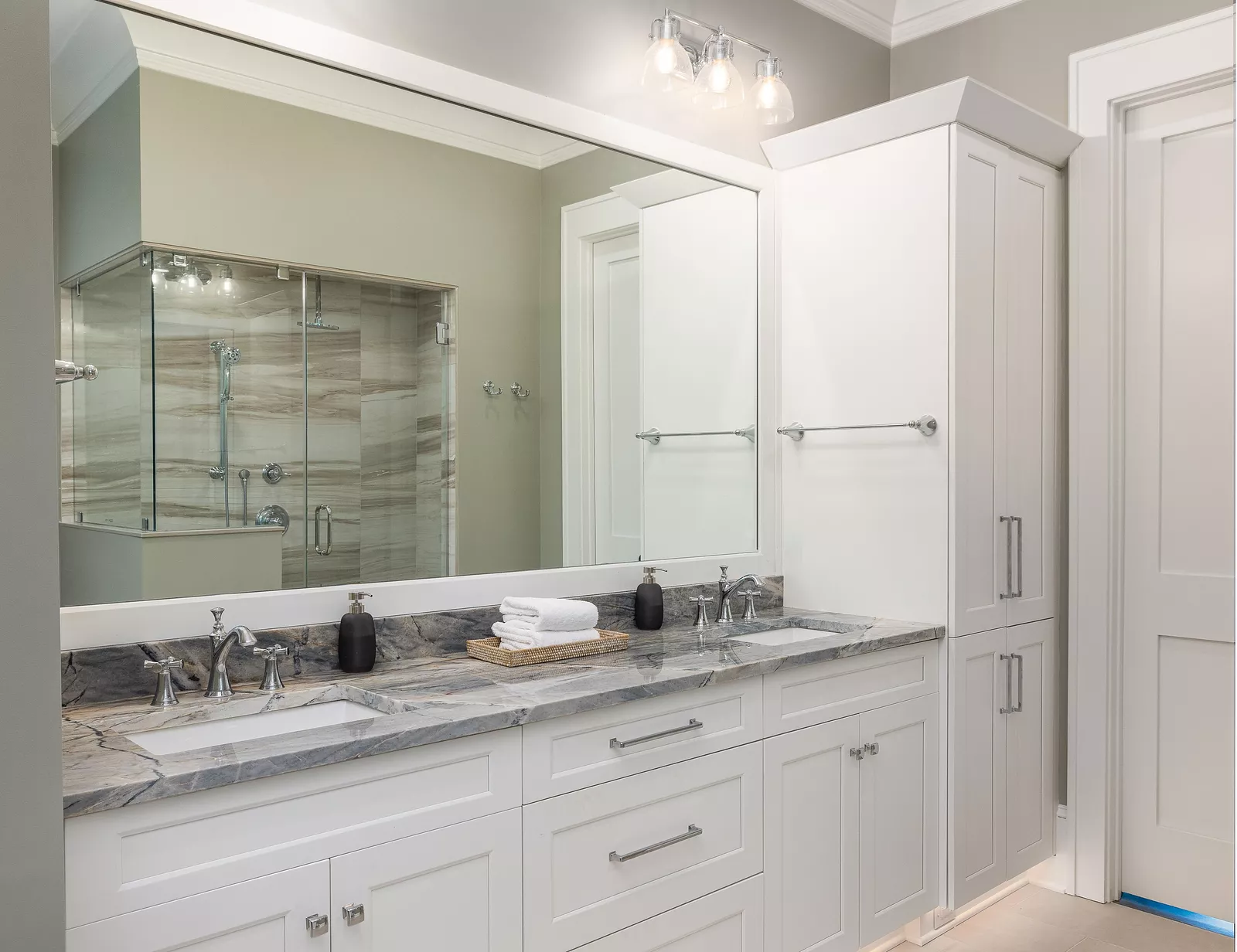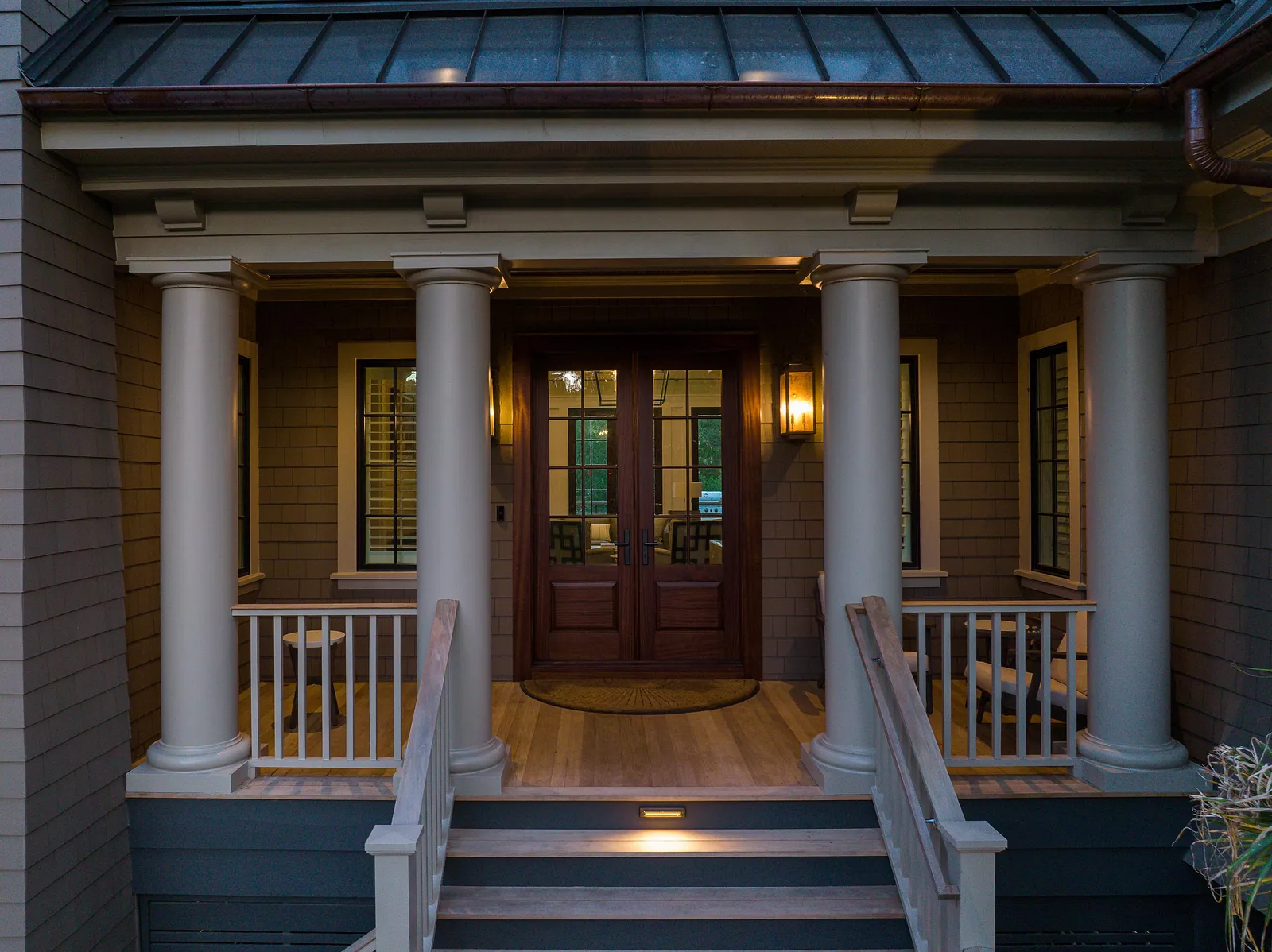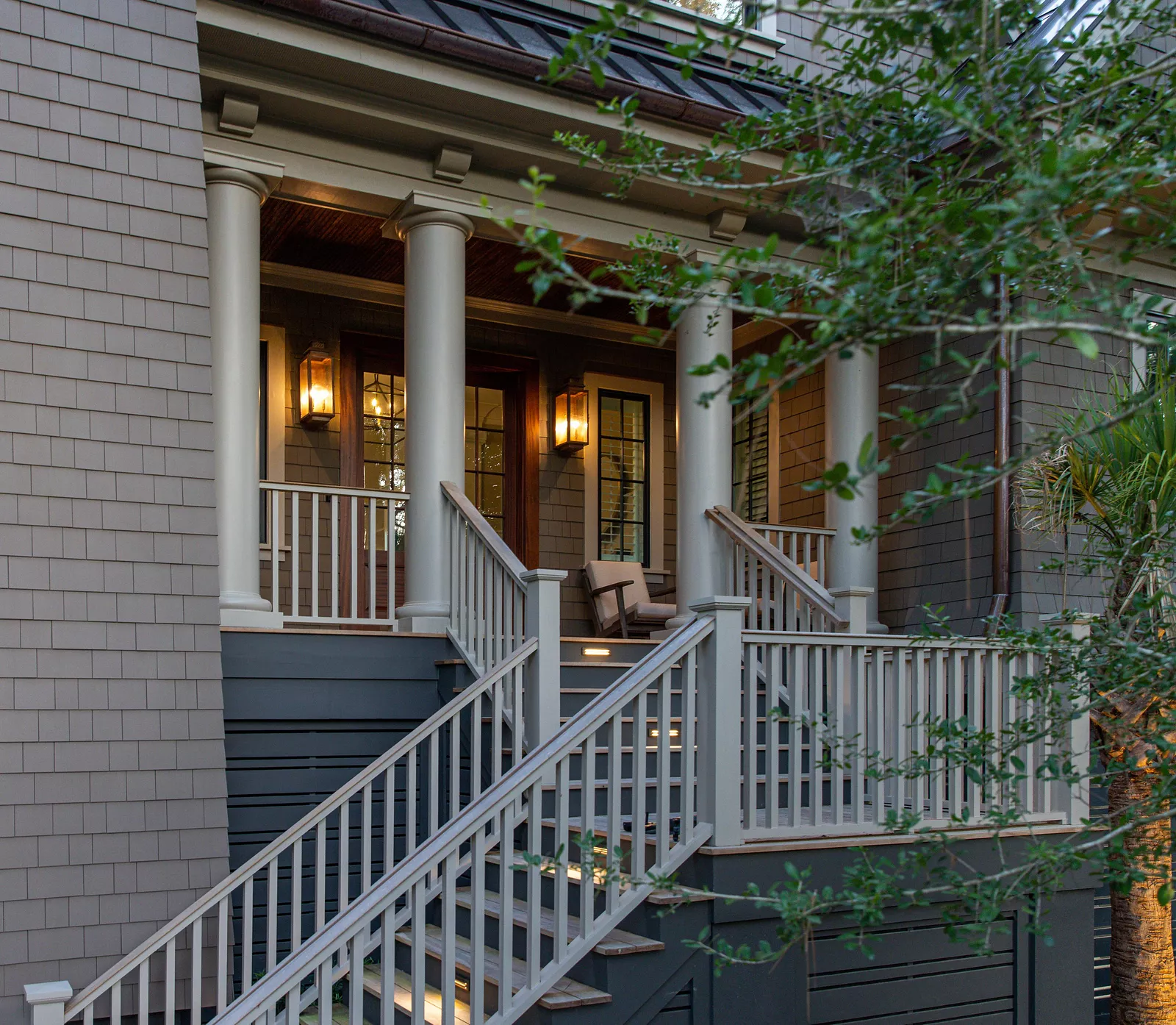 This shingle-style home has a grand brick-entry stair with iron railing, flanked by a stair tower and a gable roof with tongue and groove detailing.